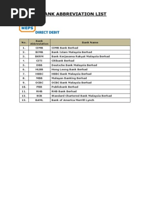 Bank Abbreviation List Usana Health Abbreviation List No Bank Abbreviation Bank Name 1 Cimb Cimb Bank Berhad 2 Bimb Bank Islam Malaysia Berhad 3 Bkrm Bank Pdf Document