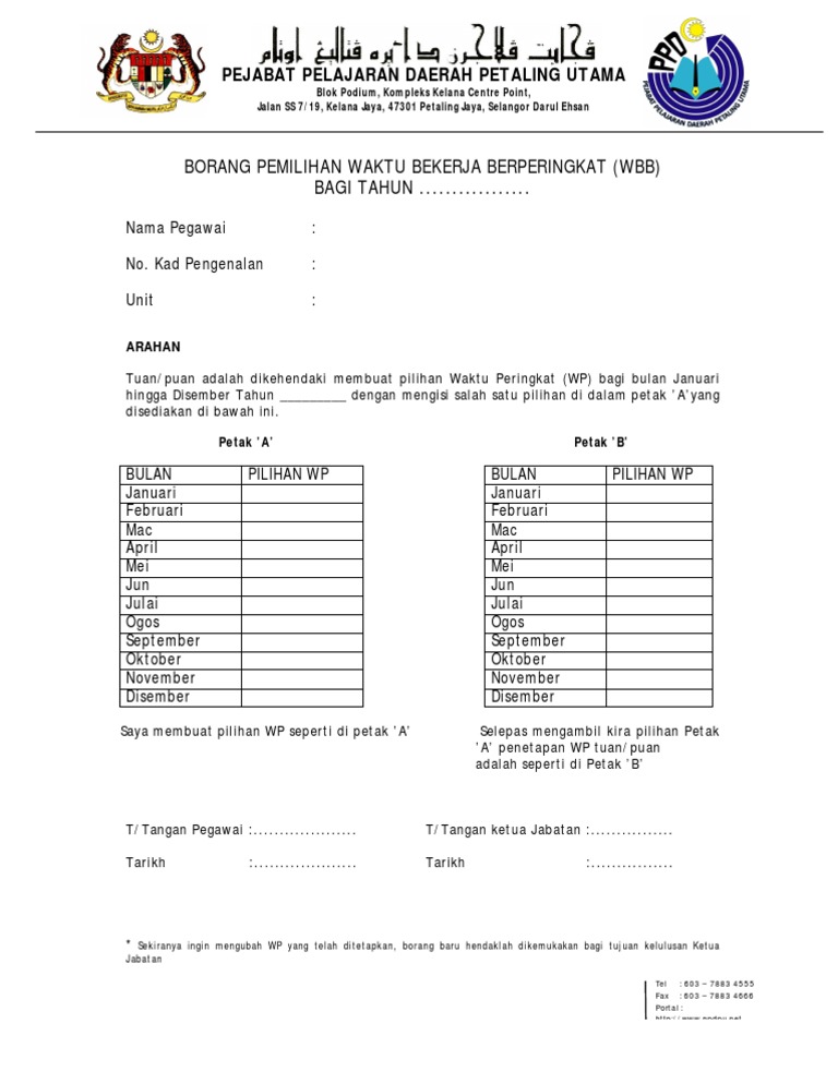 Waktu bekerja berperingkat wbb telah dilaksanakan di semua agensi kerajaan persekutuan mulai 1 jun 2007 sebagaimana yang ditetapkan di dalam pekeliling perkhidmatan bilangan 2 tahun 2007 dan surat pekeliling perkhidmatan. Borang pemilihan waktu bekerja berperingkat wbb ukm pkp bpsm 10 no. Waktu bekerja berperingkat kampus ukm bangi waktu peringkat wp hari waktu bekerja waktu rehat waktu bekerja wp1. Borang pemilihan waktu bekerja berperingkat wbb bagi tahun.