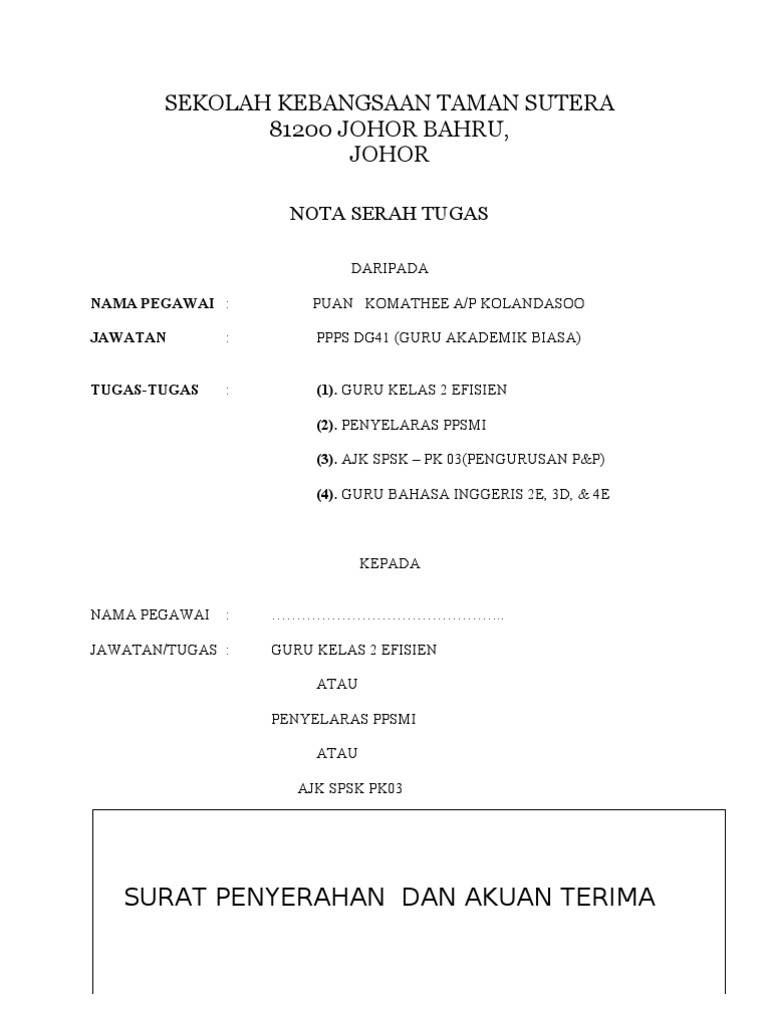 Contoh Nota Serah Tugas Perpindahan Guru
