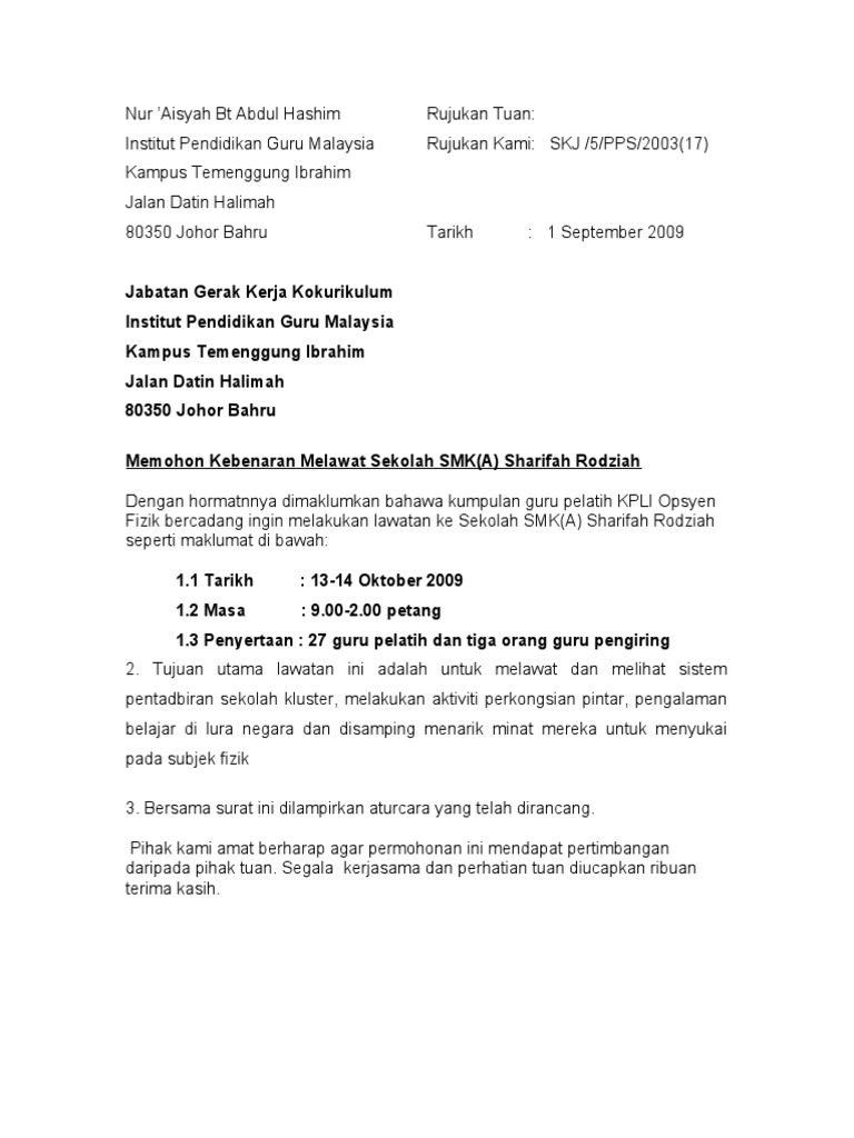 Contoh Surat Permohonan Kebenaran Lawatan Sambil Belajar