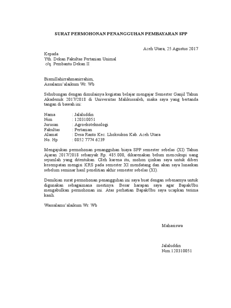 Surat Permohonan Penangguhan Pembayaran Spp