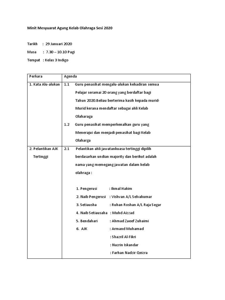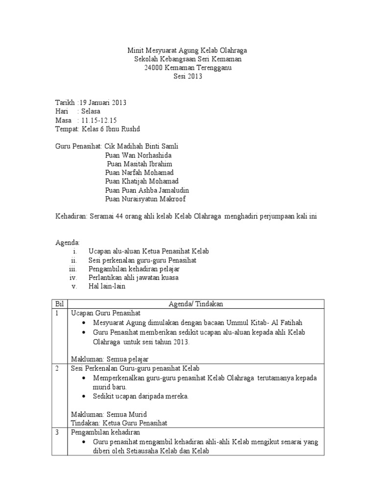 Minit Mesyuarat Agung Kelab Olahraga Pdf Document
