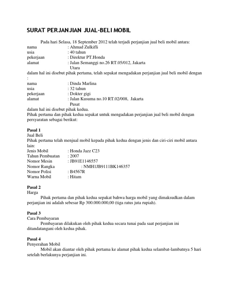Draft Lengkap Surat Perjanjian Jual Beli Mobil Portalinvestasi Com