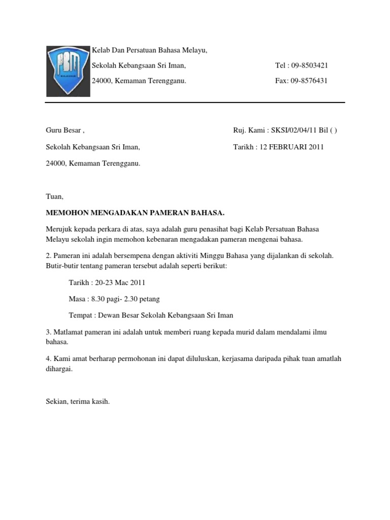 Contoh Surat Rasmi Permohonan Aktiviti Kelab Dan Persatuan Bahasa Melayu